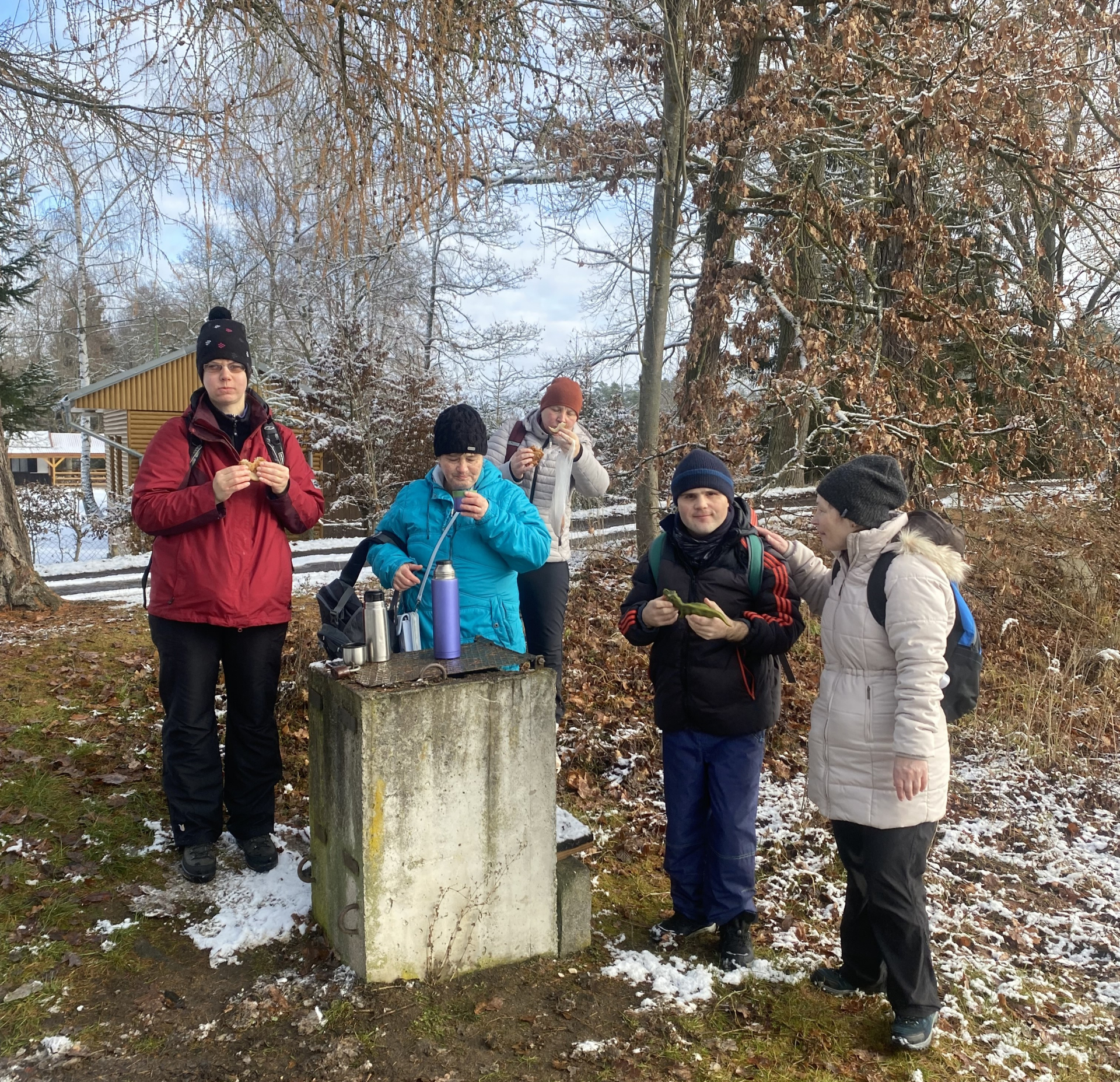 27.11.2025 Pět nejodvážnějších uživatelů se vydalo na výšlap, i když čerstvě napadl sníh. A nelitovali. V lese to vypadalo jako v pohádce. Vyrazili po již známých cestách až k rybníku Hadí, kde si odpočinuli a posvačili. Při návratu se zastavili na zámeckém nádvoří v Blatné okouknout přípravy na první adventní víkend. Dali si něco teplého na zahřátí a posledních pár kilometrů už zvládli bez potíží. Určitě do konce roku vyrazí ještě alespoň jednou. A kam to bude? To se nechte překvapit.